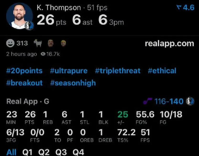 Wow, Thompson is on fire... Actually, not just on fire, his recent form is excellent as he seems to have returned to his peak level,averaging 17 points per game over the past five games, shooting an impressive 47.8% from the field and making 4.4 three-pointers per game (22 of 46).He finally looks like the player the Mavericks hoped he would be.