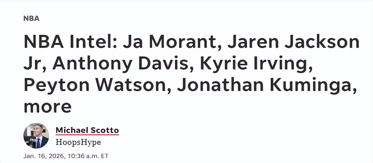 On January 17th Beijing time, three weeks ahead of the NBA trade deadline, HoopsHype gathered the newest information about Grizzlies stars Ja Morant and Jaren Jackson Jr., Mavericks stars Anthony Davis and Kyrie Irving, Nuggets forward Peyton Watson, and Warriors forward Jonathan Kuminga.