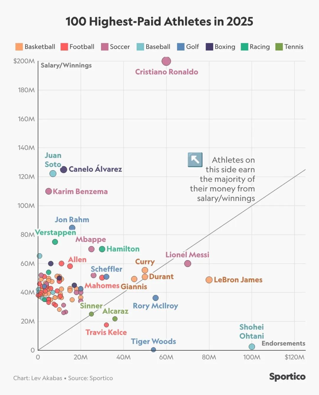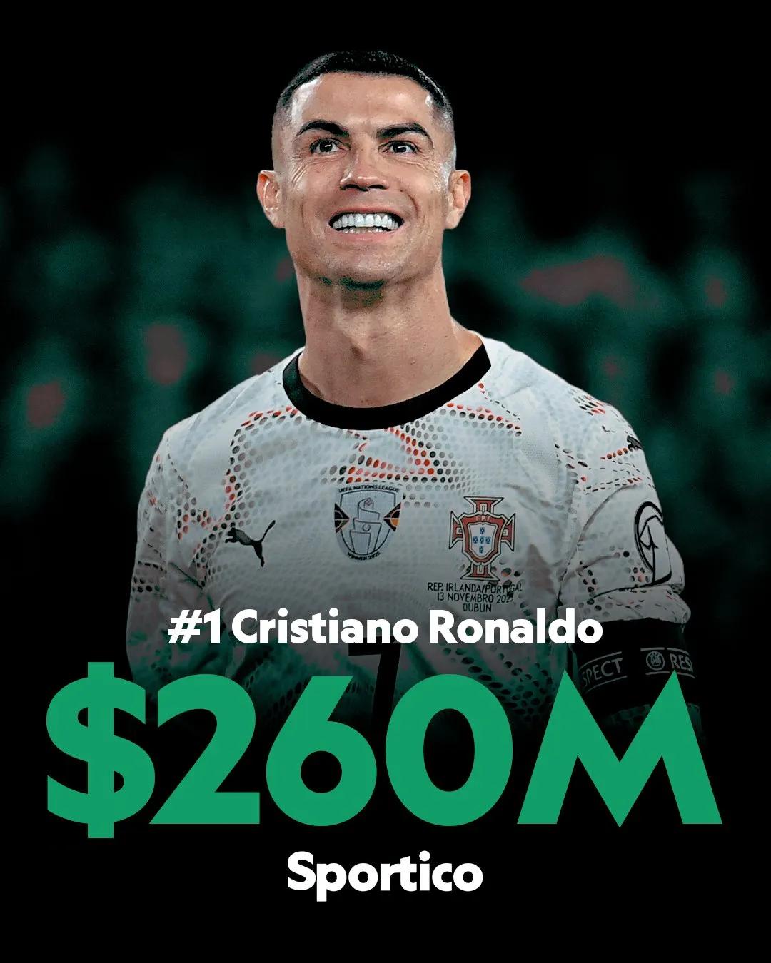 Written by Han Bing. The American sports finance online media Sportico recently published its 2025 ranking of the top 100 highest-earning athletes. Ronaldo, who receives a post-tax annual salary over $200 million at Al Nassr, had total earnings of $260 million last year, securing the top spot for three consecutive years and rightly called the "world's richest athlete" in the sports world.