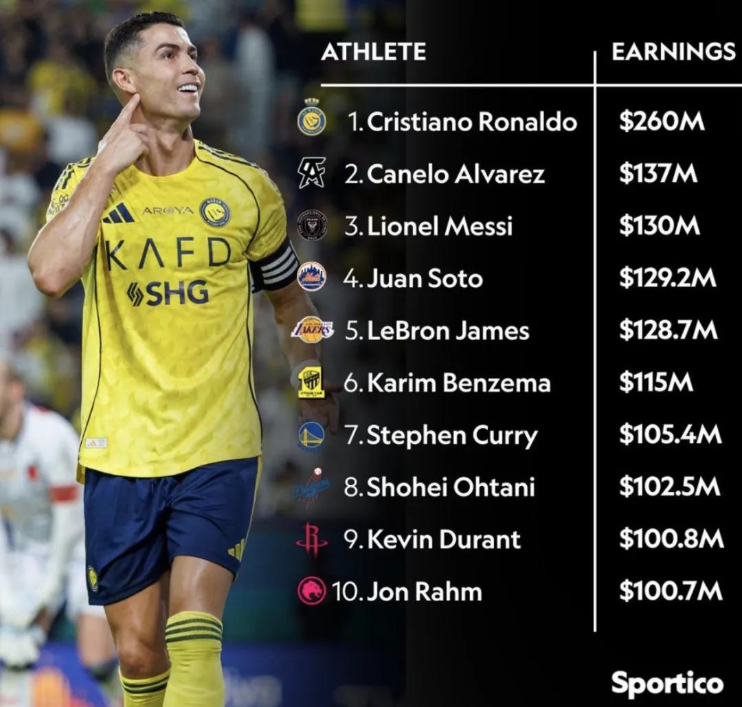 However, at the end of 2022, after Ronaldo joined Al Nassr with a staggering post-tax salary of $200 million, the Portuguese star claimed the "world's richest athlete" title for three consecutive years: in 2023, Ronaldo earned $275 million, followed by golfer Jon Rahm with $203 million, and Messi, who joined Inter Miami that summer, earned $130 million; in 2024, Ronaldo remained first with $260 million, NBA star Stephen Curry ($154 million) and British boxing champion Tyson Fury ($147 million) ranked second and third, while Messi's income grew by $5 million but dropped to fourth place; this year, Ronaldo is still number one ($260 million), Mexican boxer Canelo Alvarez ranks second ($137 million), and Messi is third ($130 million).